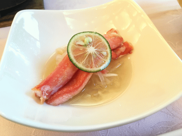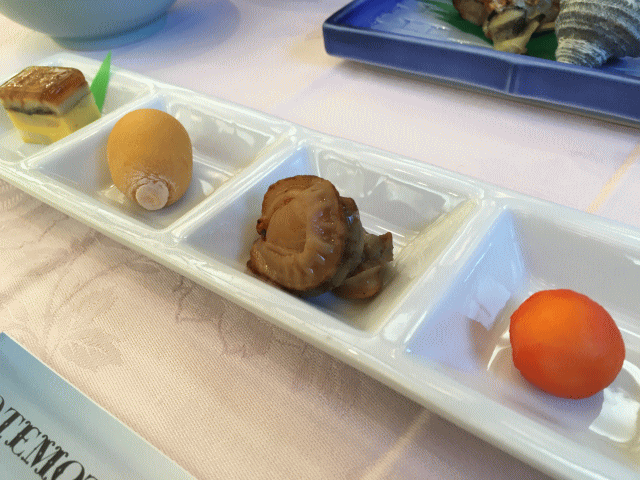 細かく見ていきましょうか。まずは先付けに相当するようなもの。フルーツも一緒に置いてあるのかなと思ったら、一番右側はサーモンとクリームチーズのおつまみみたいなもので、ワインによく合いそうでした。