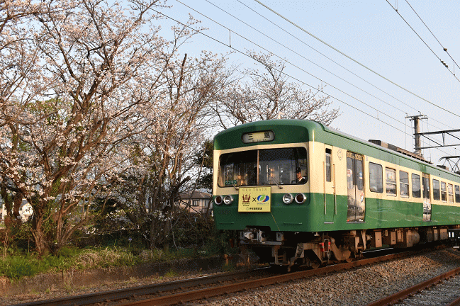 修善寺から戻ってきた旧軌道線塗色電車を桜とともに撮影。(2019.4.6 17:18)