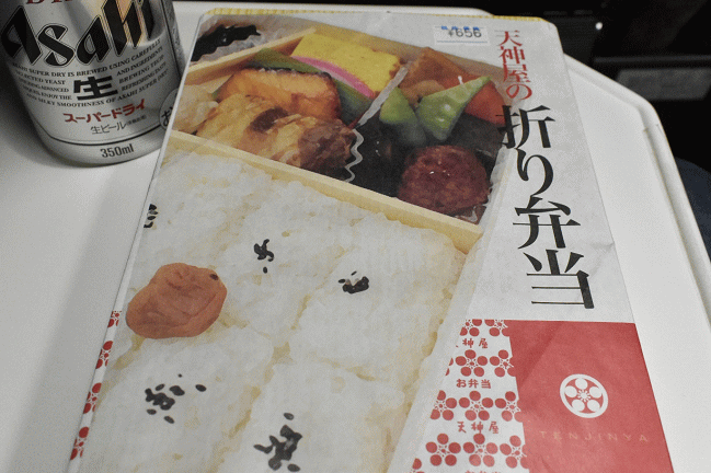 お惣菜店で購入した「折り弁当」は俵型の御飯や経木の容器など、ちょっと駅弁に共通するものがありました。「ホームライナー浜松3号」車内で夕食としました。