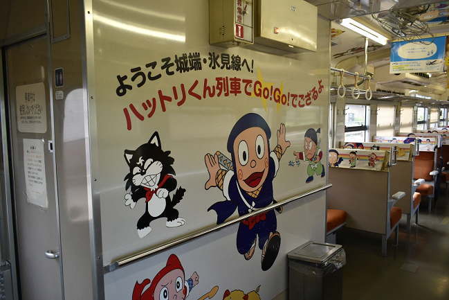 楽しいラッピングです。作者である藤子不二雄A氏が氷見市出身であることから、氷見線・城端線のキハ40のうち4両に「忍者ハットリくん」のラッピングが施されているそうです。