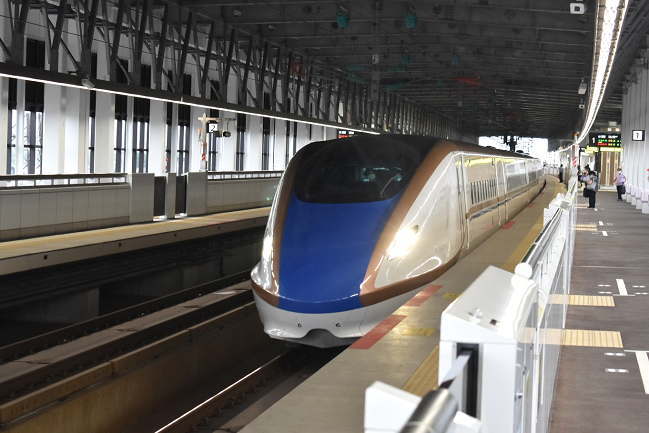 北陸新幹線新高岡駅は2面ホーム2線のシンプルな構造です。富山まで「つるぎ」に乗車します。12両編成のうち乗車できるのは4両の自由席のみでしたが、それでも10名程度の乗客数でした。なお今回使用した「世界遺産 白川郷・五箇山フリーきっぷ」は金沢~富山間の北陸新幹線も乗り放題となり、かなり便利でお得です。(2020.8.23 17:49)