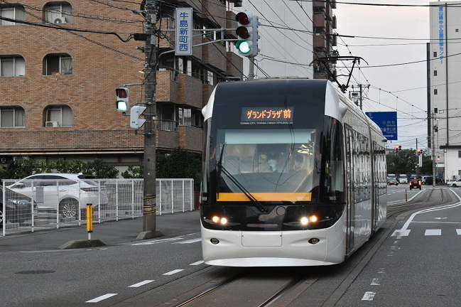 電停1つ分を歩いて、インテック本社前電停から環状線直通の電車に乗ります。富山駅から先は環状線に直通しラケット状に戻る系統が日中は1時間に2本、南富山行・富山大学前行がそれぞれ同じく1本ずつ運行されていますが、よそ者にはなかなか複雑です。南北接続区間は当然ながら実際に乗るとあっという間で、何だか物足りないのでそのまま環状線を1周して富山駅に戻りました。(2020.8.23 18:24)