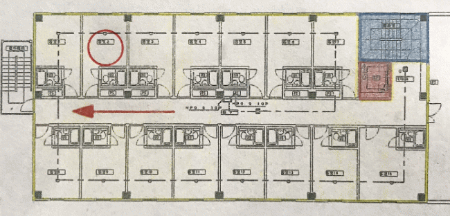 今回泊まった部屋は、下の赤い丸のところの部屋です。電話では、4階か5階の線路に近い部屋で、日立駅方向を向いている部屋と言えば、分かってくれるはずです。