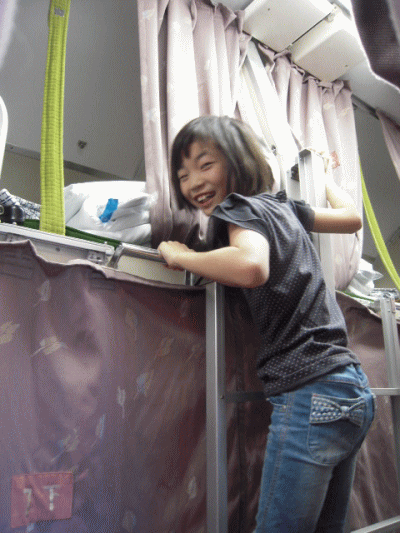 ●上段に上るはしごではしゃぐ娘。梯子を上り下りしたくなるんですよね、子供って。寝台車自体が、非現実的な空間で、子供は本当に喜びます。