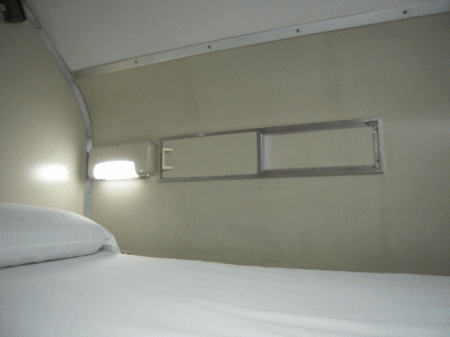 ●A寝台上段。小窓が付いていて、開けると外が見えます。が、大きな窓の付いている下段の居住性とは、比べるべくもないですね。