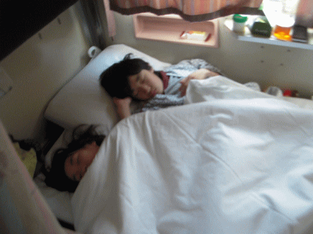 ●A寝台下段で、発車前の子どもたち。既に深夜帯で、非常に眠そうです。