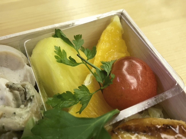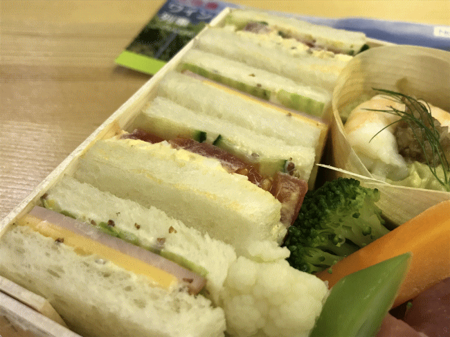 サンドイッチは、そのままの状態でお弁当箱に入っているため、ちょっとパサパサした状態でした。サンドイッチをお弁当として提供するときには、いつもその問題に直面します。ラップに巻けばよいのですが、手間がかかりますし、難しいですね。