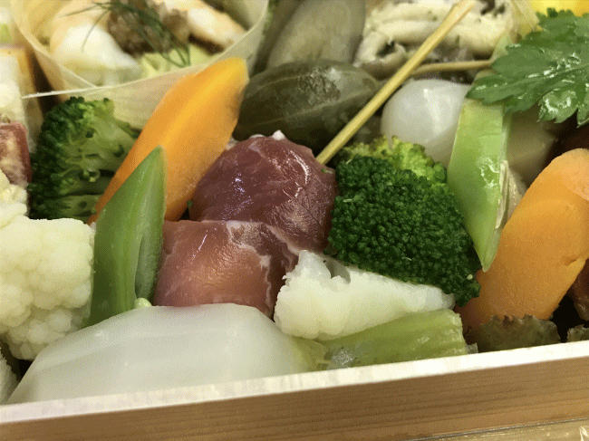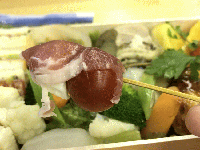 ピンチョスの周りには、生野菜に見えてそうではない、彩野菜のコンソメ煮がたっぷり。「信州野菜を中心に和牛のコンソメで柔らかく炊き上げました」との事。彩りも良く、そして本当に柔らかく、とても消化に良さそうです。コンソメ煮の上品な味が、ほのかに感じられます。