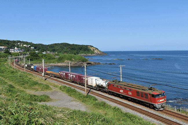 直江津方面に向かうEF510牽引の貨物列車が通過します。直江津方面の上り列車は画面左側の道路脇から撮影することができます。かつて大阪行「トワイライトエクスプレス」の撮影名所でもありました。しかし順光となるのは午後です。(2018.6.17 7:39)