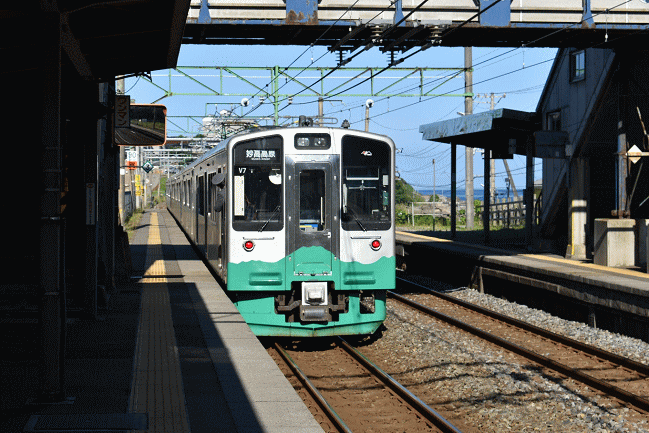 先ほどホテル客室から入線の様子を撮影した、えちごトキめき鉄道の車両による柏崎6:58発の妙高高原行に乗車します。ET127系6連は通勤通学対応でしょうが、日曜日の今日は1両に4~5名程度のお客さんでした。(2018.6.17 6:54)
