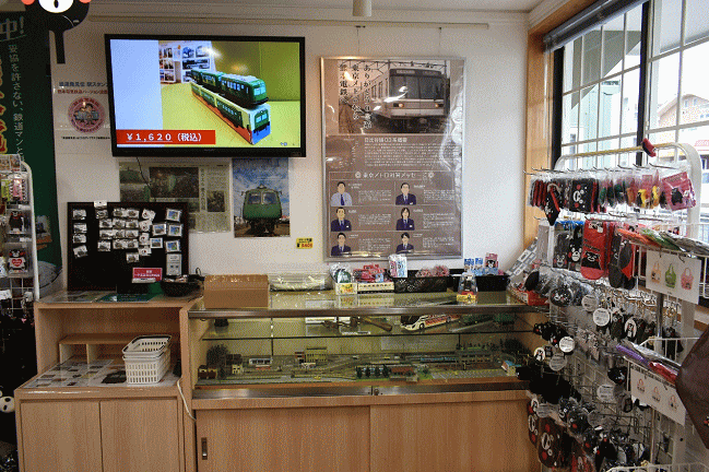 店内は熊本電鉄グッズが充実しています。店の広さは写っている範囲の4~5倍といったところでしょうか。