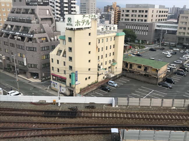 ところで、窓から線路を見下ろすと、ちょうど対面には別のトレインビューホテル、クルメターミナルホテルが見えました。楽天トラベルで客室内の様子を見るとかなりレトロなホテルではありますが、機会があれば、トレインビュー側の客室を予約して、泊まってみたいと思います。