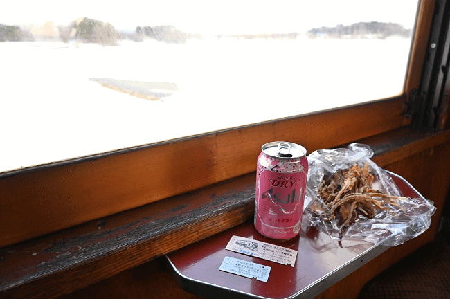 アテンダントさんがストーブで焼くスルメに、たくさんのスマホやカメラが向けられます。一般用客車もボックス席が埋まる盛況で、幾度となく訪れている私としてはその人気は全く衰えない印象です。ストーブ車両への乗車に必要となるストーブ列車料金は2014年12月に導入された当初が400円、2020年12月から500円、昨年12月の改定後は1000円となりましたが、その価値は十分にありそうです。
