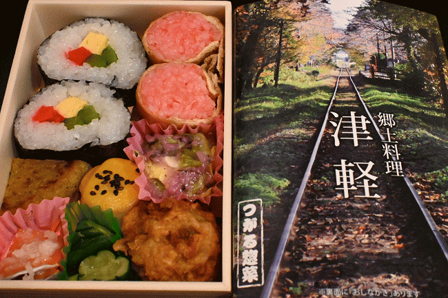 夜食はお昼頃に弘前で列車を乗り換えた際に、駅のお弁当売店で購入した「郷土料理 津軽」(1200円)を食しました。お寿司をはじめとして、全体的に甘い味付けが津軽の味だそうです。