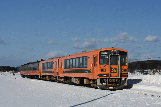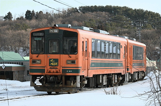 駅から北へ約300m、徒歩約5分と駅から近い踏切で撮影活動を実施しました。津軽五所川原行154列車=ストーブ列車です。残念ながら機関車ではなく、メロス号の牽引でした。