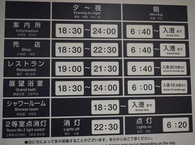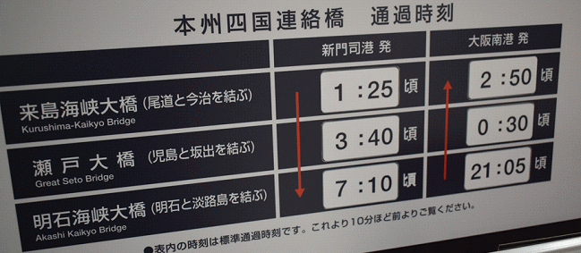 レストラン等の営業案内と本四連絡橋の通過時刻です。橋はライトアップされているとのことですが、午前1時や3時に起きているのはさすがに難しいです。