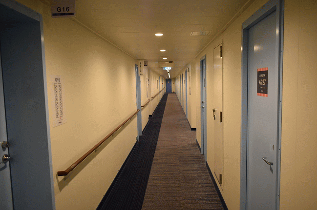 客室並ぶ区画の廊下はホテルのようです。