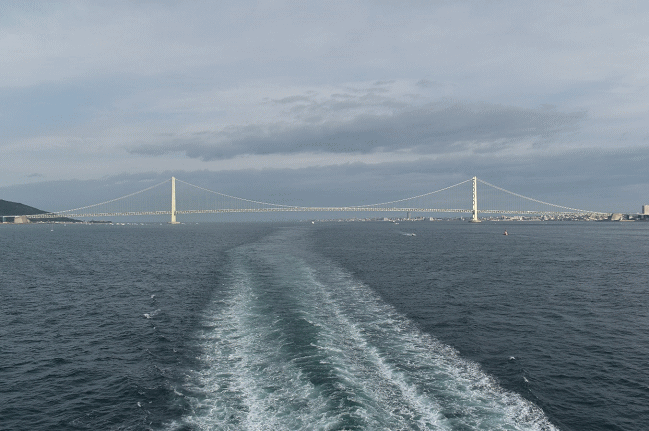 本日は午前中の軍艦島に続いて船の旅となります。新門司港を出港は19:50、周囲は港湾施設に囲まれた殺風景な場所ですが、ターミナル職員の方々によるお見送りが旅情を盛り上げさせてくれます。…しかし同じ頃、小倉駅20:17発の新幹線「のぞみ号」に乗れば当日中に名古屋に着くことができました。