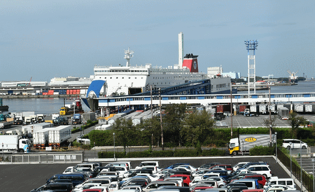 大阪南港に到着です。船からは大型トラックが次々と出てきます。こうして眺めていると貨物輸送が主体で旅客はおまけのようにも思えます。(2018.9.2 8:34)
