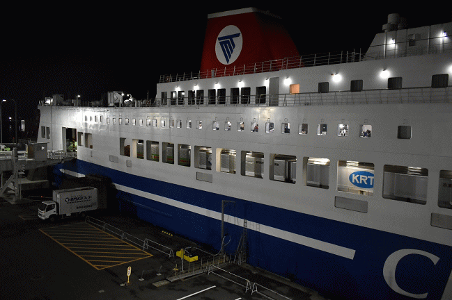 久々となるフェリーの旅、名門大洋フェリー「フェリーきたきゅうしゅうⅡ」利用で新門司港19:50発、大阪南港は翌朝8:30の到着予定です。なおこの航路は基本的に2往復の運航で大阪南港発も新門司港発と同一時刻の発着、もう1便は17:00発で翌朝5:30着となります。