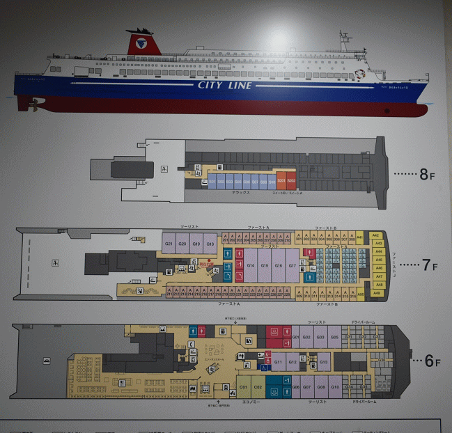 「フェリーきたきゅうしゅうⅡ」の船内案内です。6階中央に案内所と売店があり、左下にレストランがあります。スイート(特別室)からエコノミー(2等室)までの階級社会ですが、お手洗付の個室ファーストA(1等洋室)でも13470円(通常期・2~3名定員の1名あたり)と手の出ないお値段ではありません。