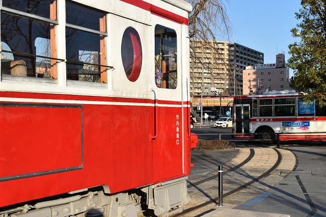 岐阜まで来たついでにJR岐阜駅の駅前広場に展示されている名鉄モ513号を見物します。2005年3月に岐阜地区600V線区の廃止とともに廃車となり2019年11月からここで保存されています。状態は非常に良好ですが、冬の午後4時過ぎは車体に影が落ちてきます。 (2021.2.6)