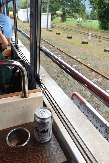 乗車時間は21分、慌ただしくビールをいただきます。我々が乗車したのは無蓋貨車トラ70000形から改造されたトラ700形車両です。