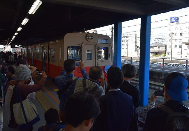 特別列車は立ち客も少々といった感じで、沿線には撮影者も少なくなかったのですが、要所 に水島臨海鉄道の職員さんが立ち会っているのが印象的でした。水島に到着すると乗客は一旦降車し、整理券を提示したうえで東水島を往復する特別列車に乗車します。 (2019.10.27 10:07)