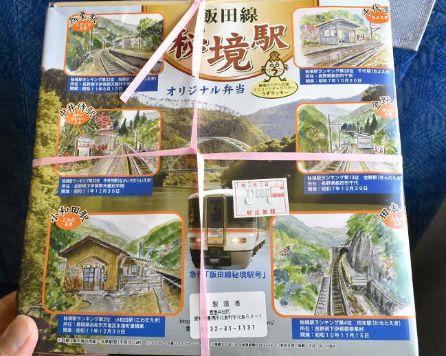 次の撮影活動に備えて、移動する新快速列車車内で昼食をいただきます。豊橋駅弁「飯田線秘境駅オリジナル弁当」(?壺屋弁当部・1080円)です。魅力的な飯田線の秘境駅、またゆっくりと訪問したいです。