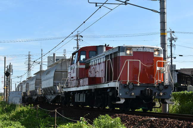 撮影活動終了後、約1㎞歩いて武豊線尾張森岡駅に到着です。ちょうど衣浦臨海鉄道碧南市発の白ホキが通過しました。尾張森岡駅のすぐ北側で撮影したものの、完全逆光でいまいちの出来です。(2019.9.6 14:47)