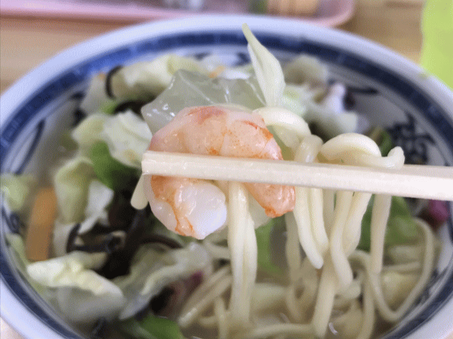 そしてもう1つ特徴的なのは、このスープです。長崎ちゃんぽんはクリーミーなスープである事がほとんどだと思うので、まるで塩ラーメンを思わせるかのようなあっさり味のスープにも驚かされました。でも、あっさり味だからこそ、たくさん入れられた海鮮の味を強く感じる事ができますね。