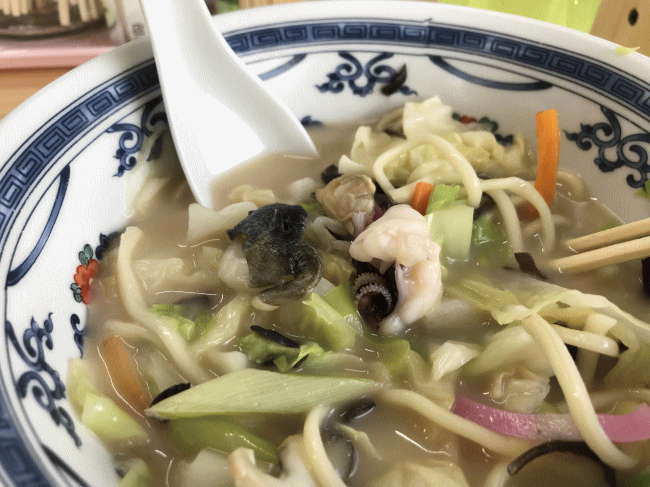 私が驚いたのが、サザエです。ここのちゃんぽんは、濃厚な味わいかつ、比較的お値段も高価であるサザエがたっぷりと入っているのです。これには驚きました。シコシコとした歯ごたえが実に良いです。