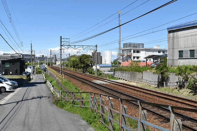 赤池駅から日進工場を跨ぐ県道陸橋を進み、1㎞ほどのところで3000形を撮影します。豊田線列車が赤池駅を出発し、高架線で日進工場の敷地を超えた直後の地点が撮影ポイントです。
