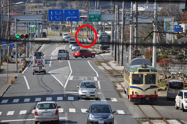 宇治団地前電停にある歩道橋から西側(伊野方面)を5年前に撮影。2000形が停車中の場所が八代信号所、赤丸が八代通電停です。2014年に信号所は八代通電停の更に奥(西側・伊野寄り)に移設されました。(2013.2.11)