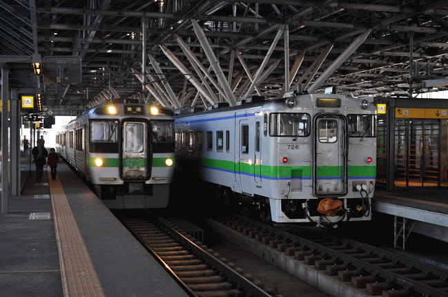 旭川からの普通列車は、さすがにお客さんの「鉄分」は薄くなり、多くが地元の方のようです。滝川から乗り換えた「ライラック34号」は、旭川で網走からの特急「大雪」に接続している関係か、ほぼ満席で座れず。そして岩見沢から乗った区間快速列車内で、完全に日が暮れました。