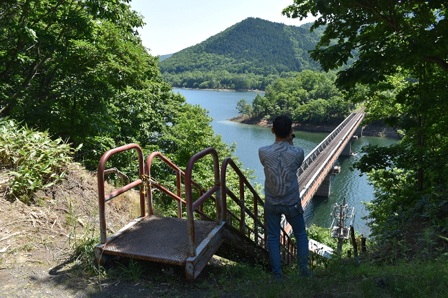 金山湖を渡る鉄橋は撮影ポイントで、P氏は取材に余念がありません。道路脇にあり車利用なら便利な場所です。金山ダム建設に伴い1966年(昭和41年)に線路が付け替えられた区間でもあります。(2023.6.26 9:44)