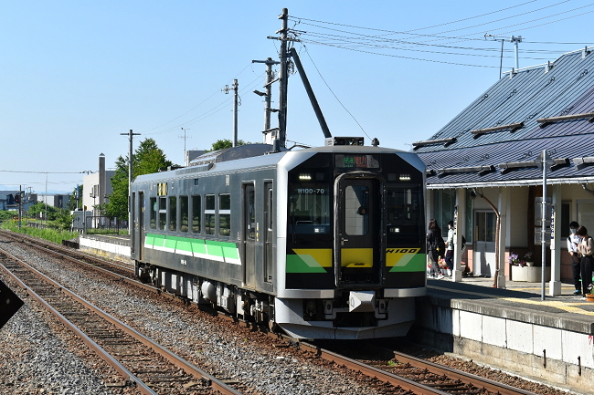 上富良野駅で旭川行924D列車と交換、旭川着が通学ラッシュのピークを過ぎるためか、単行運転でした。行き交う列車は全てH100系となり、新鮮です。(2023.6.26 7:42)
