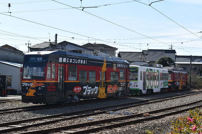 2月11日をもって営業運転の終了が決まっているモ3202(写真左から2両目)は車庫内に留置されており、この日の運転はなさそうでした。代替となるモ803(写真右から2両目)は、営業運転に向けて準備工事中のようです。(2020.2.2 12:35)