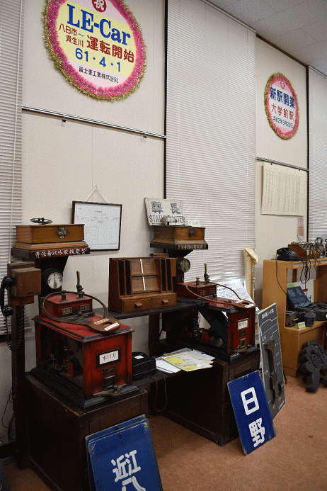 屋内では近江鉄道関係の部品展示やグッズ販売が行われていました。