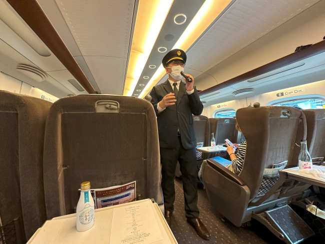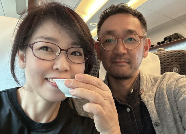 今回のおいしい新幹線では、dancyu食いしん坊倶楽部の部長、植野広生さんがJRの制服に着替えてお客を迎えてくださり、鮨トークを炸裂されました。植野さんの話術を楽しめるのも、おいしい新幹線の魅力の一つでしょう。