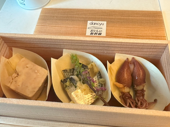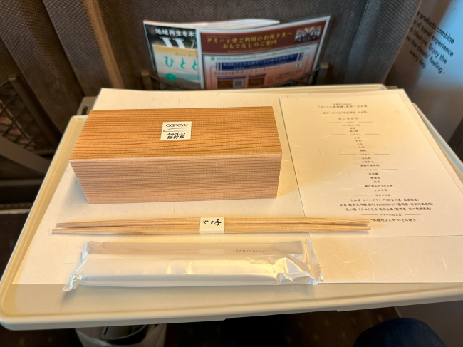 さて、食事はこのようにして運ばれてきました。箱は木目調ながらもプラスチック製ですが、おいしい新幹線のシールが貼られており、特別な気分になりますね。