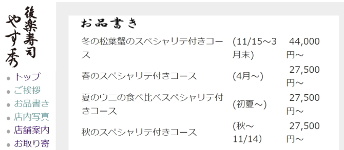 やす秀のホームページを見ると、お寿司コースは上記のような価格帯です。今回のおいしい新幹線は1人55000円。日本酒3本とソフトドリンク、名古屋までの移動料金を含めて55000円なのですから、決して高くありません。