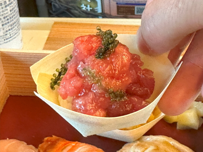 伊豆下田の金目鯛、熊本の車海老、長崎対馬の穴子、勝浦の鮪、北海道のウニです。マグロとウニは本来なら海苔で巻いたり軍艦巻きだったりするのでしょうが、新幹線での提供は難しいという事で、それぞれ小丼にして提供されました。マグロはいくつかの部位が入り、海ぶどうがまぶしてあります。