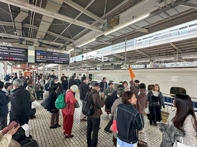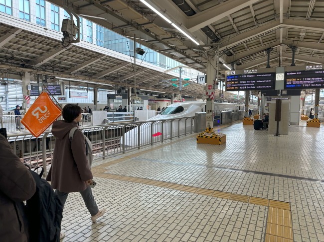 さて、いよいよおいしい新幹線に乗り込みます。初の試みだったからか、供食スタッフは発車の直前まで慌ただしく準備しており、私たちが乗り込むのも発車の10分前くらいに。JR東海のオレンジの旗を掲げた添乗員に連れられて、ホームに上がりました。