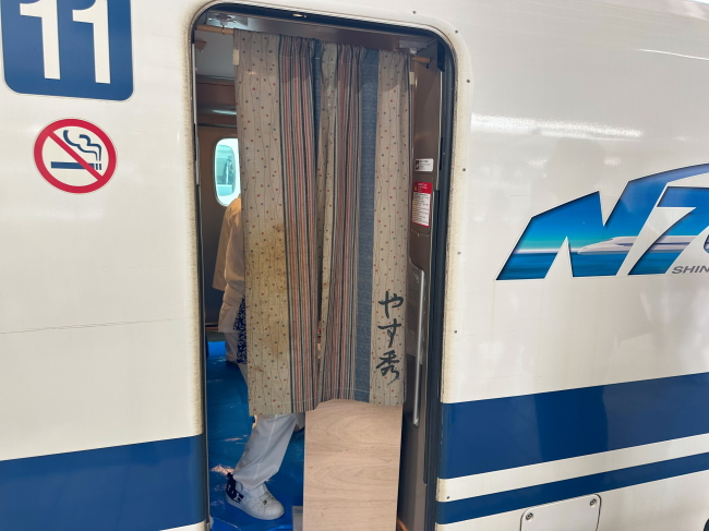 お寿司は、グリーン車の車販準備室を厨房に見立てて、握られました。鉄道車両に寿司屋の暖簾が掛かっているのはかなりユニークな光景でした。