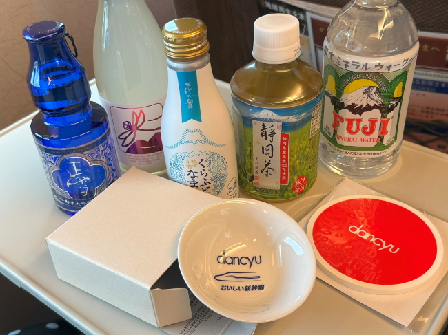 神奈川の地酒(スパークリング)1本、静岡の地酒2本、お茶と水、dancyuのコースター、そして、今回の旅にあわせて作られた、おいしい新幹線ロゴ入りのぐい吞みが付いていました。お酒の銘柄もきちんと書いておきますか。