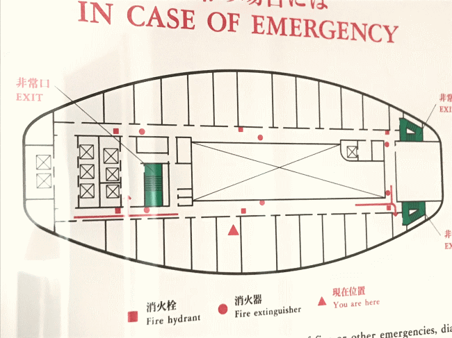 宿泊したのは、下の図の三角マークのある部屋です。図の下が南、上が北、左が西で右が東です。