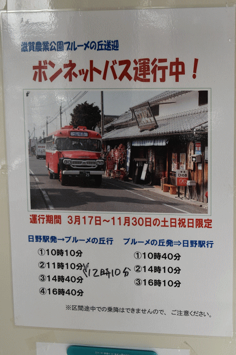 ブルーメの丘発のボンネットバスが日野駅前に姿を現しました。本日の最終便です。「彦根ご城下巡回バス」時代と比較して塗色などは大きく変わっていないものの、白ナンバーとなり「近江鉄道」の表記もなくなりました。今年2月に「ブルーメの丘」に譲渡されたそうです。(2018.5.5 17:25)