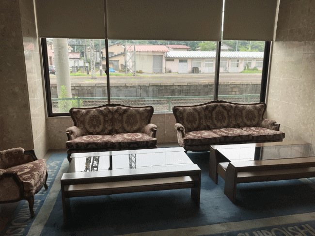 最後に、ホテルのロビーの待ち合わせスペースです。ここからも、線路や駅のホームが良く見えます。長居するところではありませんが、線路と反対側の客室の人は、ここからボーっと鉄道を見ておくのも良いでしょう。