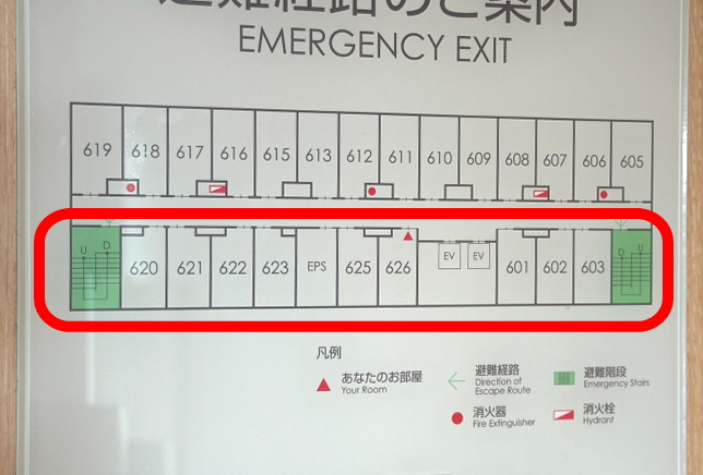 三交イン四日市駅前の客室配置図は、以下の通りです。写真の赤い部分の全ての客室が、トレインビュー側です。高さ的には、4階より上の階が良いでしょう。ただし、トレインビューをお願いしても、確約はしてくれませんので、その点はご納得ください。